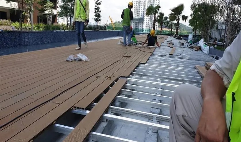 Sàn gỗ nhựa là hạng mục thi công hấp dẫn tại khu vực ngoài trời như: ban công, sân vườn, hồ bơi,… nơi tiếp xúc mưa nắng trực tiếp, độ ẩm ướt cao.