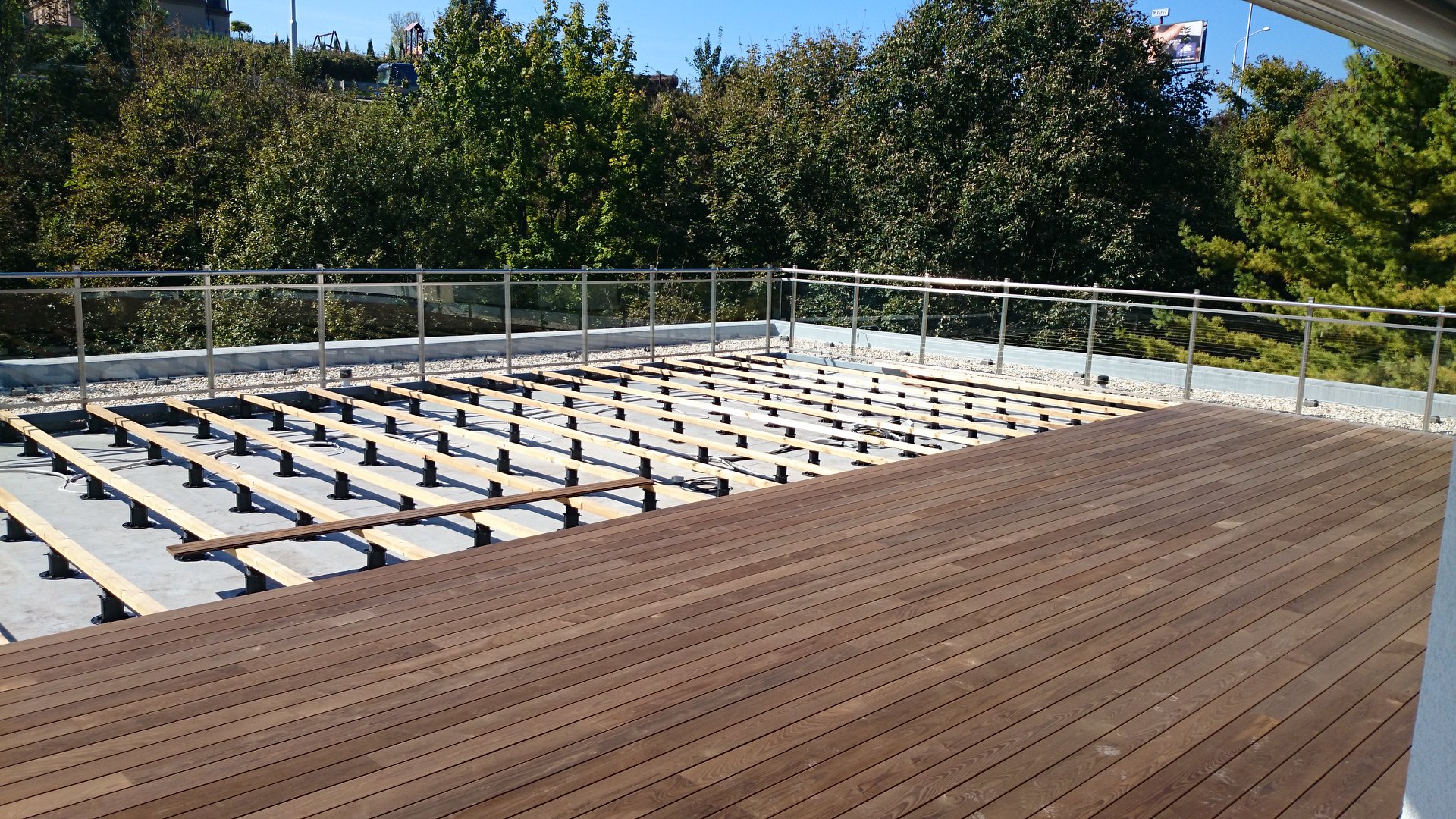 Để công trình có độ thông thoáng, ta bắt buộc phải lắp đặt sàn gỗ nhựa trên khung xương. Tuyệt đối, không cố định sàn trực tiếp xuống mặt nền. Độ cao tối thiểu của khung xương là 30 mm.