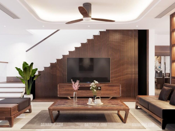 Mẫu phòng khách sử dụng nội thất gỗ đánh bóng cổ và sang trọng